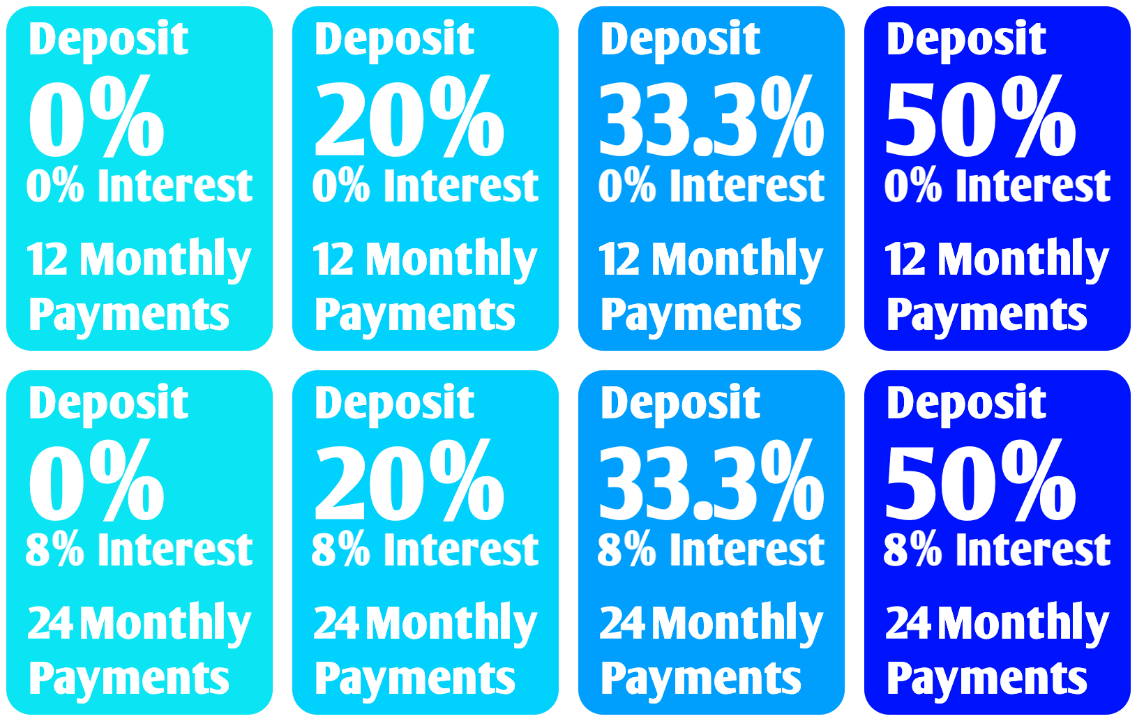 Bad credit rating - 50% deposit required. Balance on finance over 1 to 2 years, 0% over 1 year & 8% over 2 years charged on the Interest on the balance. If your confidant within yourself and you can meet the deposit & the payments each month! And you can gather all the necessary paperwork we require together!, Just complete the form at the bottom. ..If you're NOT sure "Come and see us".