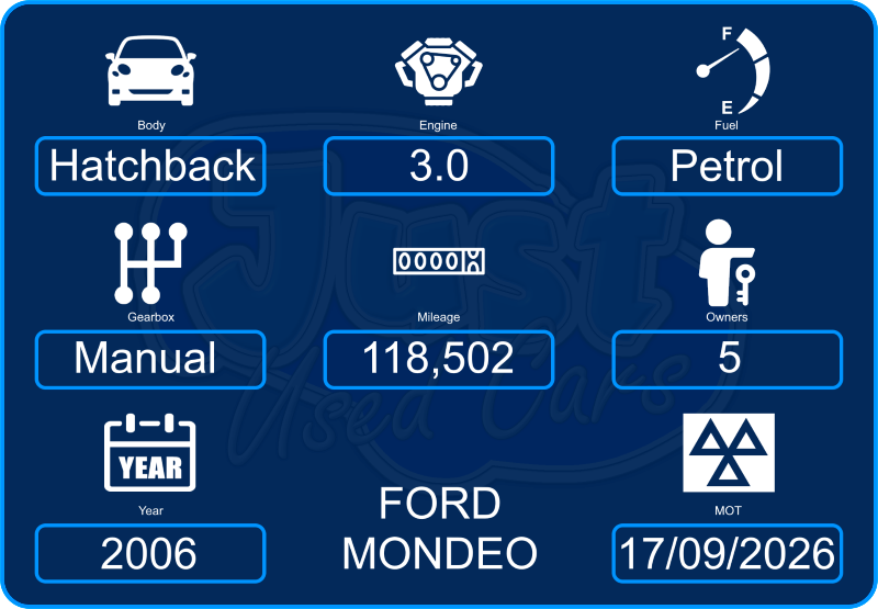 Ford Mondeo ST220 3.0 V6 (Manual Petrol) 56 Reg 2006, 118,502 miles (Approx), 5 Former keepers, The service history book is completely filled and fully stamped up to 102K, The wheels could do with refurbishing again!, There are a few other bits that need doing: The blower doesn’t clear (Demist) the main window, One of the centre vents has lost its ability to flick-on-and-off, The ariel on the roof needs replacing as it’s the wrong type, Handbrake needs some adjustment (Lack of use), It had a full set of discs & pads & a full set of premium tyres & rear shocks fitted before being stored away, We have own this car for around 6 years, But we put the logbook in our name from June 2023 and then put it in dry storage until September 2025, This car is now back and ready to go, Overall it’s in good condition for the year (See Pictures).